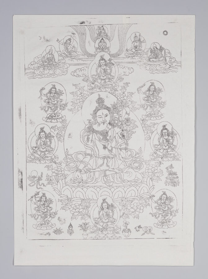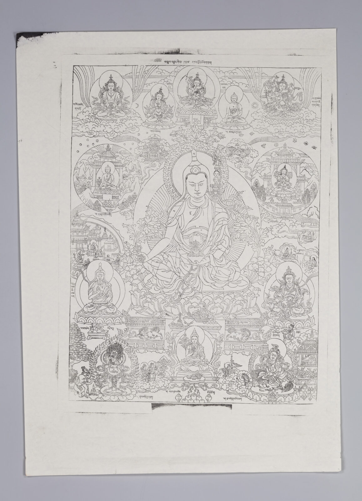 This woodblock print was printed at the Derge Printing House in the Kham region of southeastern Tibet (modern-day Ganzi, Sichuan Province, PRC). Founded in 1729, it is one of the largest and most important producers of traditional Tibetan woodblock prints. The drawing/painting model (par tsa) for six of the compositions in this set, including this one, are by the painter Tangla Tsewang (1902–1989), a Karma Gardri painting master and scholar from nearby Pelpung Monastery, as well as scribe and court painter to the eleventh incarnation of the Situ hierarchs. Compositions by Tangla Tsewang in this set all have color notations, letters indicating which color to use.