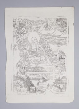 This woodblock print was printed at the Derge Printing House in the Kham region of southeastern Tibet (modern-day Ganzi, Sichuan Province, PRC). Founded in 1729, it is one of the largest and most important producers of traditional Tibetan woodblock prints. The prints’ models (par tsa) for this set were painted by Tangla Tsewang (1902–1989), a Karma Gardri painting master and scholar from nearby Pelpung Monastery, as well as scribe and court painter to the eleventh incarnation of Situ hierarchs.