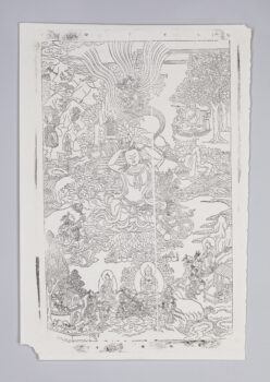 This woodblock print was printed at the Derge Printing House in the Kham region of southeastern Tibet (modern-day Ganzi, Sichuan Province, PRC). Founded in 1729, it is one of the largest and most important producers of traditional Tibetan woodblock prints. This set of compositions depicting the Twelve Deeds of the Buddha is based on paintings attributed to the famous late 19th-century master painter Purbu Tsering of Chamdo.