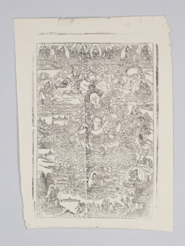 This woodblock print was printed at the Derge Printing House in the Kham region of southeastern Tibet (modern-day Ganzi, Sichuan Province, PRC). Founded in 1729, it is one of the largest and most important producers of traditional Tibetan woodblock prints. According to the printing house, the painter of this print design (Tib. par rtsa ’bri mkhan) is Purbu Tsering of Chamdo (Tib. gru pa phur bu) (active ca. late 19th century).