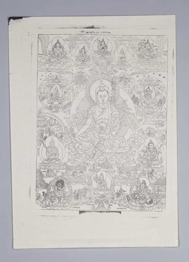 According to the Derge Printing House, the original composition was painted following the instructions of Zhuchen Tsultrim Rinchen (1697–1774), a famous editor and designer of paintings. Born into a family of artists in Kham, he studied traditional artistic skills under his father, the artist Ngawang Chopel, assisting with several local painting projects, and supervising painting murals of jataka tales and the life of the Buddha at the monastery of Rakchu Namgyel. In the 1730s, Tsultrim Rinchen became heavily involved in the publishing activities of the newly founded Derge Printing House under the patronage of the King of Derge, Tenpa Tsering (1678–1738). He was put in charge of major printing projects, such as the Sakya Kambum and a new edition of the Tengyur (Buddhist commentarial literature). He also continued his involvement with artistic works, planning and supervising paintings, such as illustrations of the narratives of the Buddha’s previous lives from the Wish-fulfilling Vine and images of the 16 arhats. See his biography on Treasury of Lives.
