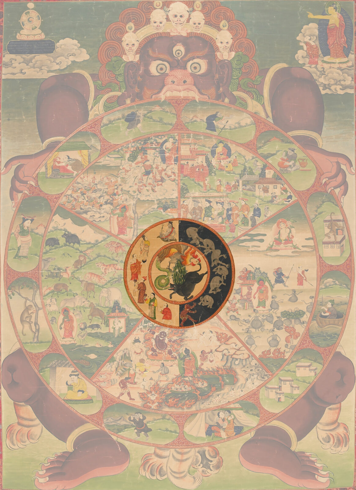 Wheel of Life, attributed to Lhadripa Rinzing Chungyalpa (b.1912, Sikkim–d.1977); Sikkim; c. 1930; pigments on cloth; Rubin Museum of Himalayan Art; C2004.21.1