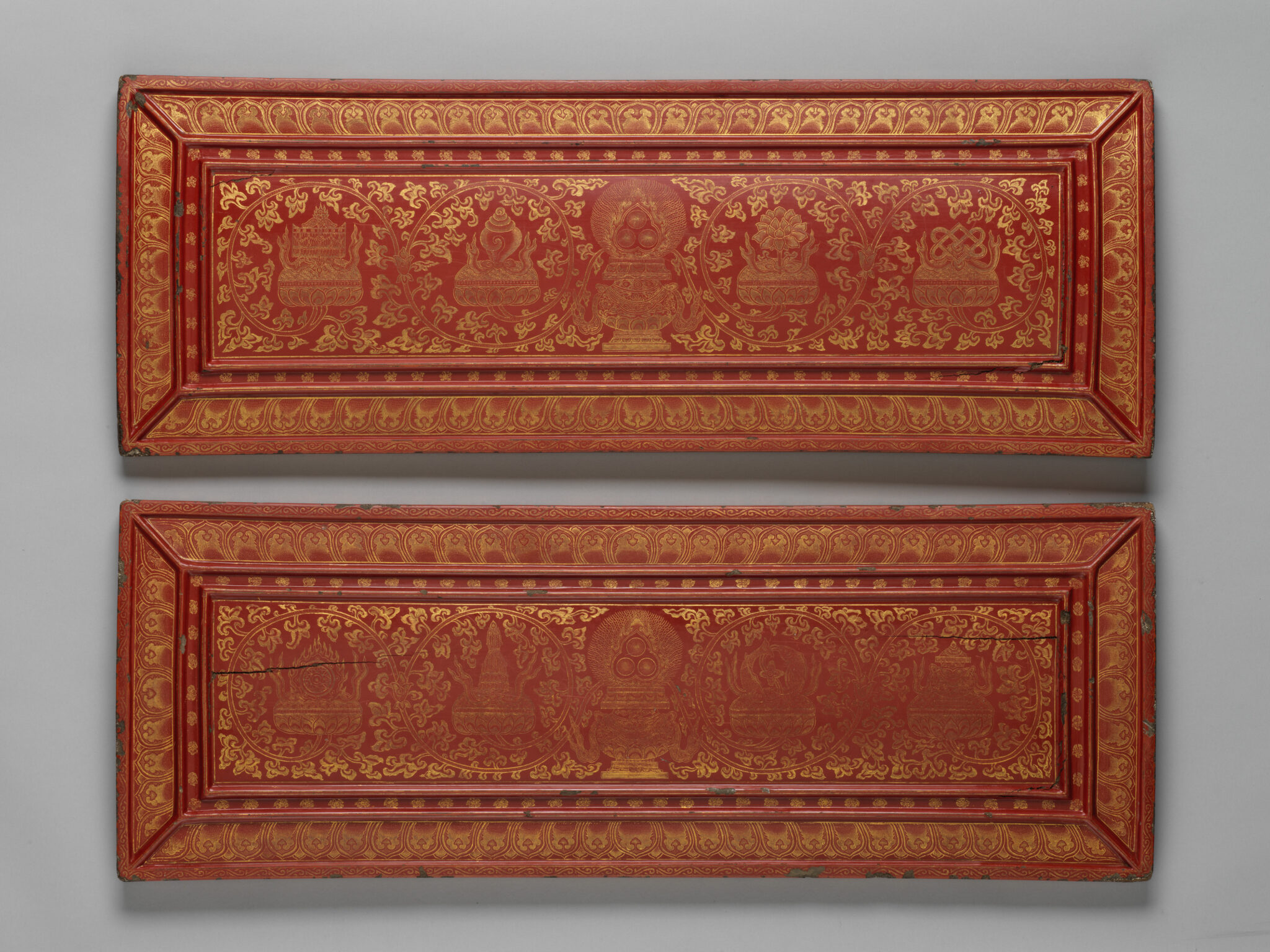 - Red lacquer, incised decoration, gold inlay