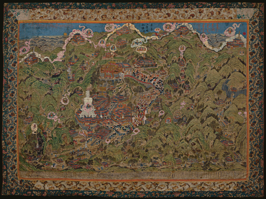 This map is a panoramic view of the sacred mountain Wutaishan Five Terrace Mountain, located in Shanxi Province of China, believed to be the earthly abode of the Bodhisattva of Wisdom Manjushri, and has been a focus of transnational pilgrimage for the Chinese, Tibetans, Mongols, and Manchus alike.