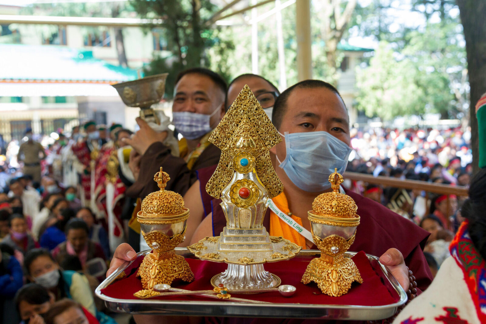 A nonedible wangtor made of silver and gold being consecrated during a public initiation ceremony at the Dalai Lama’s monastery in Dharmsala, India. Photograph by Pacific Press via Alamy