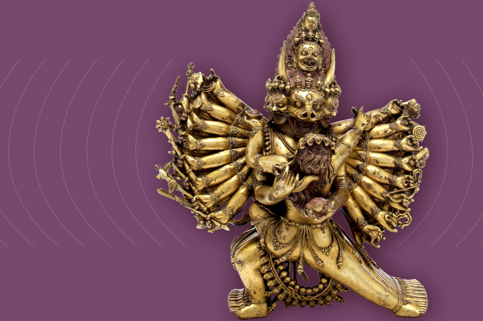 Vajrabhairava’s thirty-four hands wield various implements. The two hands that embrace the consort hold a skull cup (kapala), a reminder of impermanence symbolizing wisdom, and a curved knife, symbolizing cutting ignorance at Vajrabhairava is considered the wrathful emanation of Manjushri, the bodhisattva of wisdom. He assumed this form to mirror back the terrifying appearance of the Lord of Death, Yama. Overpowered and subdued, Yama became a protector of the Buddhist faith. Vajrabhairava is also known as Yamantaka, the Destroyer or Slayer of Yama, in reference to his power to transform even the Lord of Death. Vajrabhairava is a prominent deity in the Sakya Tibetan Buddhist tradition and one of the most important meditation deities in the Geluk tradition, which is prevalent in Mongolia. This form is based on a vision of the tradition’s founder, Tsongkhapa (1357–1419). In Mongolia Vajrabhairava’s practices helped supplant indigenous shamanistic exorcism rituals.